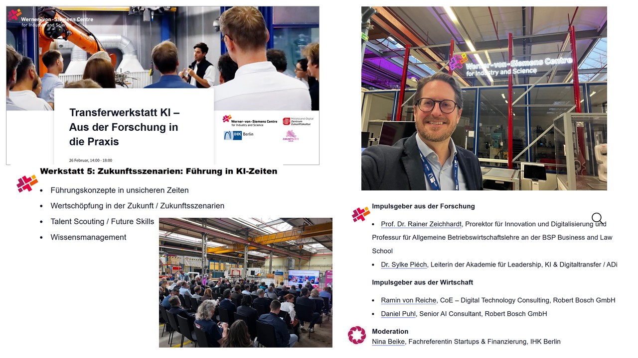 die Frage: wer führt wen?! – damit habe ich mich am 26.2.26 in einem Werkstattformat bei der Transferwerkstatt KI befasst. Zusammen mit Kolleginnen und Kollegen aus Wissenschaft und Praxis (von Bosch) habe ich als Impulsgeber an einem Thementisch mit ca. 30 Personen diskutiert. Die Transferwerkstatt KI war ein voller Erfolg. Insgesamt 160 Gäste konnten sich in einer großen Werkhalle auf dem Siemens Werksgelände in fünf Werkstätten intensiv über künstliche Intelligenz aus verschiedenen Perspektiven austauschen.